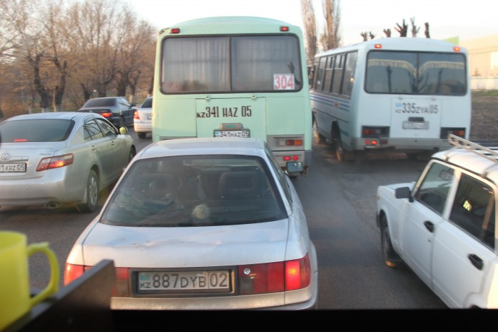Иә, бұл кептеліс. Оның Алматы асып облысқа жеткелі қашан. Бұл көліктердің бәрін ұстап тұрған мына бір теміржол өткелі. Күнде жүретін автобус жүргізушісі пойыз өтетін уақытты жаттап алған. Сағат 07:00-ге дейін өтіп кету керек, ал егер өте алмасаң көлігіңді өшіріп қойсаң да болады. Шлагбаум жарты сағаттан кейін бірақ ашылады екен.