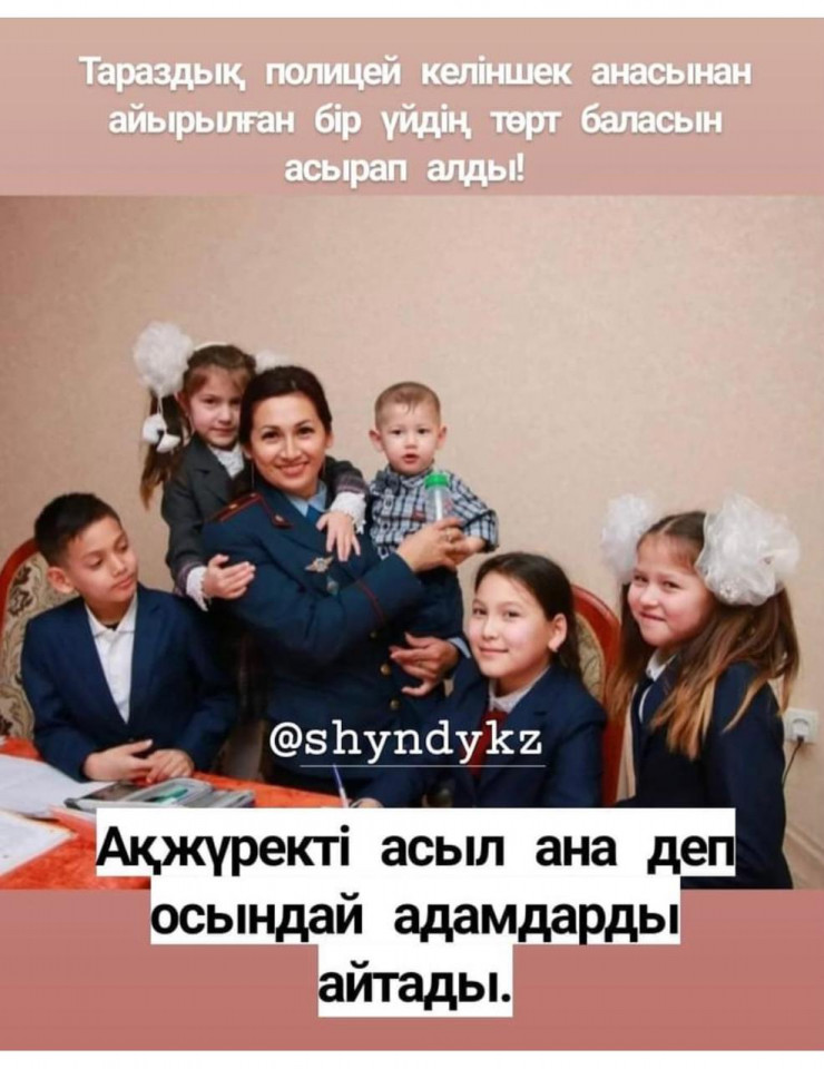 Жақында әлеуметтік желілерде "тараздық полицей келіншек анасынан айырылған бір үйдің төрт баласын асырап алды" деген сурет тараған болатын. Суреттегі полицей - Диляфруз Кенжеханова. Бүгінде ол Жамбыл облыстық Полиция департаментінде ерекше тапсырмалар жөніндегі аға инспектор. Оның айтуынша, бұл расында болған оқиға. Tengrinews.kz тілшісі бірден төрт баланы қамқорлығына алған полицеймен сөйлесті.