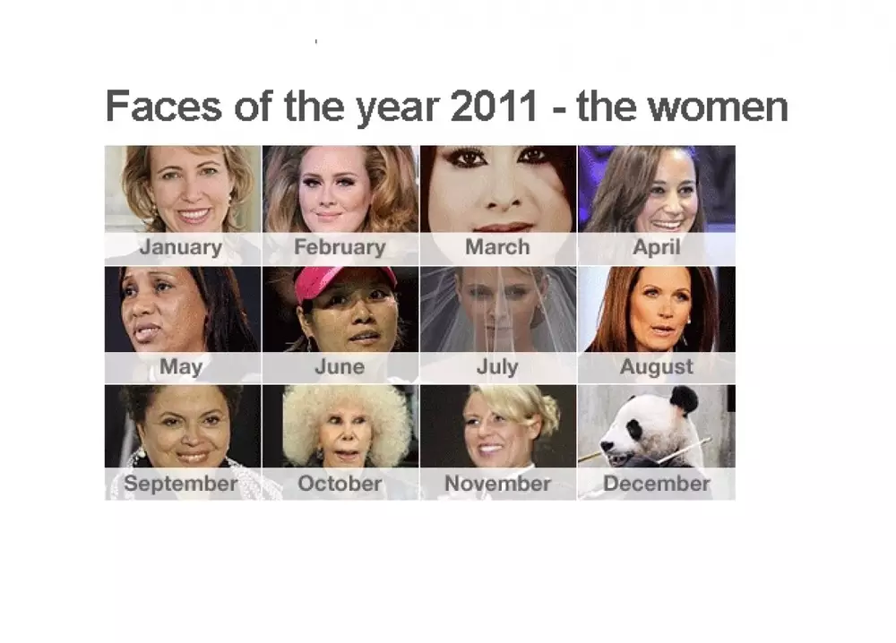 Компания BBC включила в женскую часть списка "Лица 2011 года" панду Свити, сообщается на официальном сайте корпорации. Панда стала "лицом" декабря 2011 года. В этом месяце Китай передал двух панд в аренду Великобритании. Самка Свити (Тян-Тян) и самец Саншайн (Янг-Ганаг) переехали в Эдинбургский зоопарк. Как пишет The Telegraph, включение животного в список "Лица 2011 года" вызвало негодование среди пользователей Интернета. В сети микроблогов Twitter тема обсуждалась под хэштегом #pandagate. Вместе с тем, представитель BBC заявил, что панда является "веселым дополнением" к списку, и ранее животные уже попадали в аналогичные рейтинги.