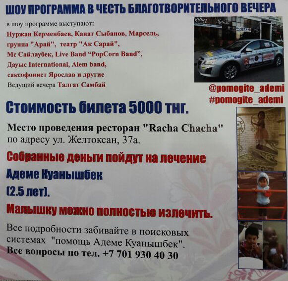 Благотворительный концерт состоится 14 сентября в 19.00 в ресторане Racha Chacha. В шоу-программе выступят: Нуржан Керменбаев, Канат Сыбанов, Марсель, группа "Арай", театр "Ак Сарай", Мс Сайлаубек, Live Band PopCorn Band, Дауыс International, Alem band, саксофонист Ярослав и другие. Входной билет стоит пять тысяч тенге. Все средства будут на месте переданы маме ребенка.