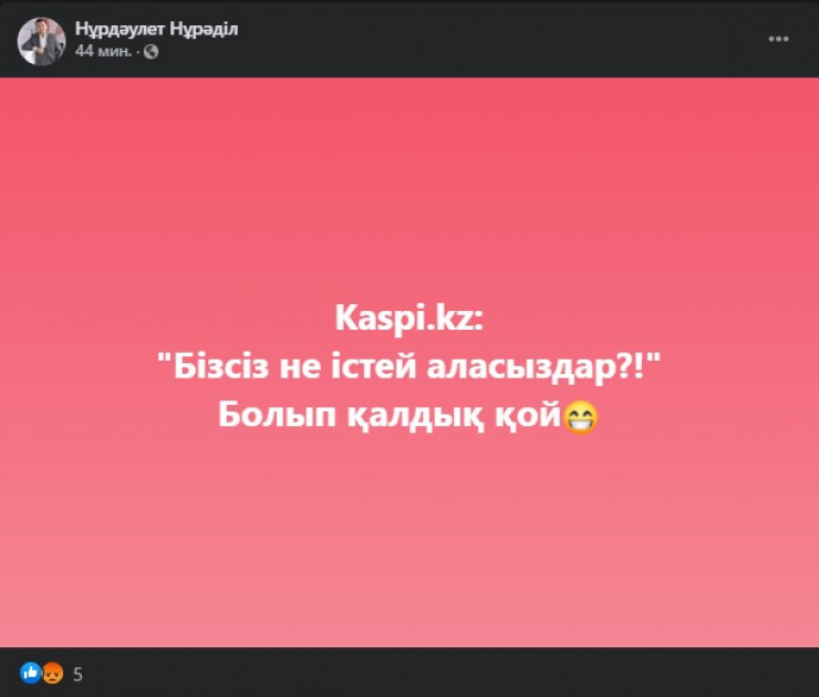 "Өкініше қарай, Kaspi.kz қосымшасында техникалық ақаулар болып жатыр! Картамен төлеу, банкоматтарда картаға ақша салу немесе оны жіберу, сондай-ақ, ақша аударымдарын жасау уақытша мүмкін болмай тұр. Біз бұл ақауды тезірек жоюға тырысып жатырмыз. Кешірім сұраймыз", - деді Kaspi.kz өкілдері.