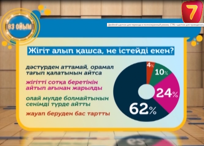 Дәл осы сұрақ бойынша бағдарлама ұжымы әлеуметтік желіде сауалнама жүргізді. Дауыс бергендер арасында 75 пайызы - қыз алып қашуға түбегейлі қарсымын десе, қалған 25 пайызы - қыздың келісімімен алып қашуға болатынын айтады.