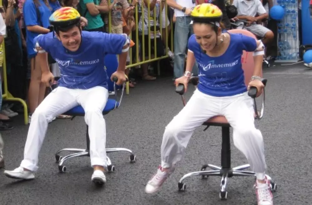 20 августа в Алматы на площади Астаны прошел "День Спорта", передает корреспондент Tengrinews.kz. Впервые на одном мероприятии собрались гонщики на офисных креслах, йоги, каскадеры и метатели компьютерных мышей. Праздник прошел в виде необычной олимпиады, в которой мог принять участие любой желающий. Помимо традиционных видов спорта проводились альтернативные соревнования по гонкам на офисных креслах и забегу на шпильках. Эти конкурсы могут показаться интересными офисным работникам, которым зачастую не хватает времени на занятия спортом, тем более что все необходимое снаряжение можно найти прямо на рабочем месте. Первыми офисные кресла оседлали ведущие праздника - известный КВНщик Нурлан Коянбаев и актриса Линда Нигматулина, которая и прибыла к финишу первой. "Офисную" тему затронул также конкурс по метанию компьютерных мышей. На соседнем участке проходили забеги на шпильках. Отметим, что участие в нем принимали не только девушки, но и представители мужского пола, которые показывали неплохие результаты. Конкурсантам выдавалась обувь на каблуках длиной шесть сантиметров. Чуть дальше проходили "бои" на подушках и "перестрелки" с использованием водяных пистолетов. Также желающие могли посоревноваться в футрестлинге, где победителями становились обладатели самых сильных ног. Более спокойная обстановка царила в шатре йогов, где горели ароматические свечи и играла расслабляющая музыка. Собравшихся людей развлекали профессиональные каскадеры - они показывали всевозможные автомобильные трюки, в том числе езду на двух колесах. Не обошлось и без мелких неприятностей - во время выступления у одной из машин на ходу отвалилось колесо. Во время инцидента никто не пострадал, а сами каскадеры не растерялись и показали еще один трюк - замену колеса на едущем на боку автомобиле. Праздник закончился выступлением казахстанской группы "Рахат Лукум" и запуском в небо неоновых шаров.