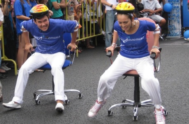 Первыми офисные кресла оседлали ведущие праздника - известный КВНщик Нурлан Коянбаев и актриса Линда Нигматулина, которая и прибыла к финишу первой. "Офисную" тему затронул также конкурс по метанию компьютерных мышей. На соседнем участке проходили забеги на шпильках. Отметим, что участие в нем принимали не только девушки, но и представители мужского пола, которые показывали неплохие результаты. Конкурсантам выдавалась обувь на каблуках длиной шесть сантиметров. Чуть дальше проходили "бои" на подушках и "перестрелки" с использованием водяных пистолетов. Также желающие могли посоревноваться в футрестлинге, где победителями становились обладатели самых сильных ног. Более спокойная обстановка царила в шатре йогов, где горели ароматические свечи и играла расслабляющая музыка.