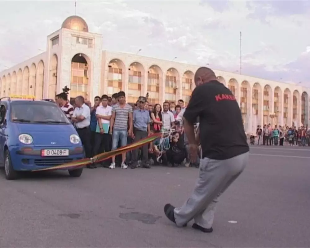 Кыргызский силач Нурлан Алишеров, больше известный как Ташчайнар - Железные Челюсти, установил в Бишкеке новые рекорды, передает корреспондент Tengrinews.kz.