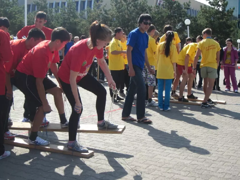 В рамках состязаний участники командой должны были перенести воду, завязав ноги скотчем. Также были организованы гонки на так называемых "лыжах". Ребята на деревянных досках с веревками, если получалось, вышагивали одновременно. Еще одно из заданий - проехать на офисных креслах по брусчатке.