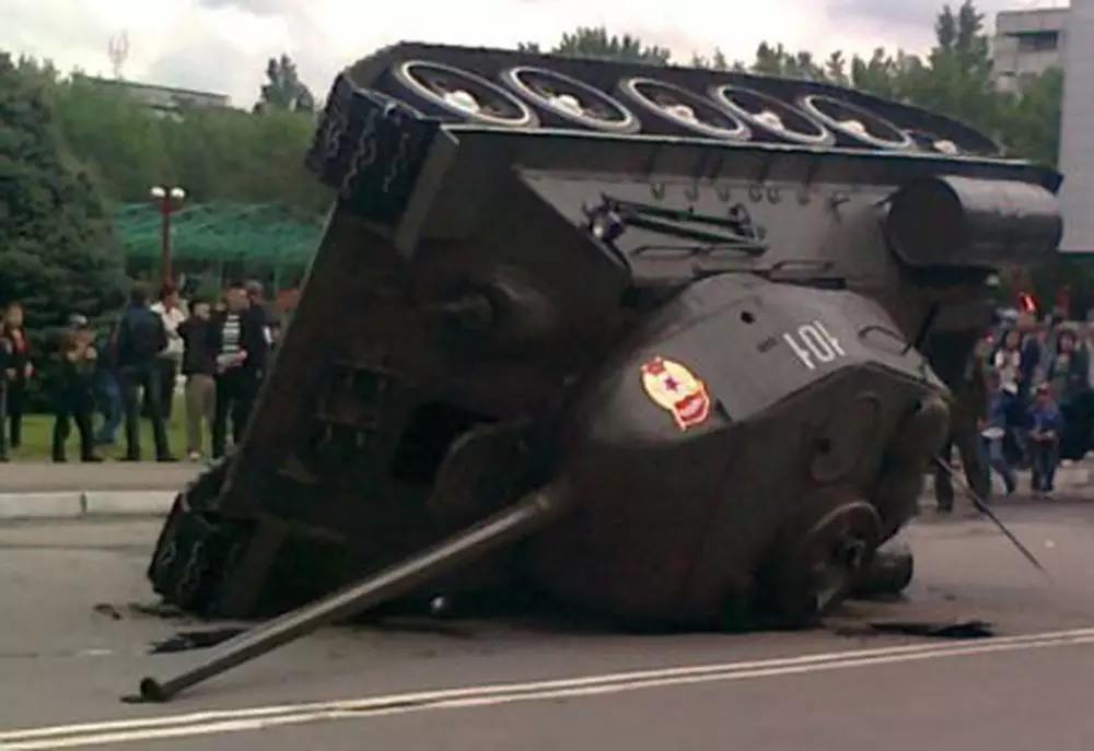 В Бишкеке во время праздничного парада, посвященный 66-й годовщине Победы в Великой Отечественной войне, на площади Победы перевернулся танк, сообщает КТК. Военный Т-34 пытался въехать на платформу. После очередного неудачного маневра боевая машина перевернулась. Для того чтобы поставить танк на платформу, военным пришлось пригнать кран. Танк Т-34 является самым известным советским танком и одним из самых узнаваемых символов Второй мировой войны. Т-34 был разработан в Харькове и выпускался серийно с 1940 года.