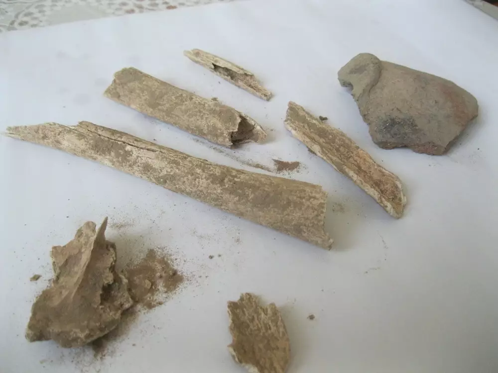 "Я начал копать отстой рядом с времянкой и обнаружил камни на глубине полутора-двух метров", - сказал Едел Таженов, проживающий в селе Алдабергеново Ескельдинского района. По его словам, когда начали отодвигать камни, то стали видны осколки кувшина с надписями и человеческие останки. "Дальше мы не стали копать. Там еще остались камни", - сказал он.