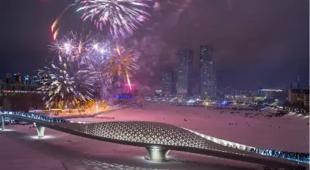 "Новогодний фейерверк разразился в полночь над Мостом Атырау, который охватывает замерзшую реку Есиль. Дизайн этого пешеходного моста вдохновлен местной (для Казахстана. - Прим.) разновидностью осетровых", - пояснил своим подписчикам Штейнмец.