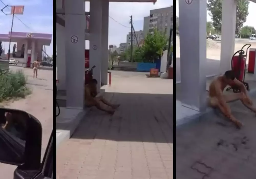 На кадрах видно, как абсолютно голый парень направляется в сторону автозаправочной станции. За дневным променадом мужчины наблюдают водитель авто и его пассажир. Шокированные происходящим очевидцы, смеясь и не стесняясь крепких выражений, высказывают предположение, что мужчина явно не в себе. Обгоняя его, авто подъезжает к АЗС, в этот момент молодой человек уже сидит на бордюре. "Парняга, ты чего, ты же голый! А, тебе нравится так ходить! Так ты же голый ходишь средь бела дня по городу", - слышится голос за кадром. Парень, оглядывая себя, отвечает, что сейчас оденется. После чего встает и бежит за отъезжающим автомобилем.