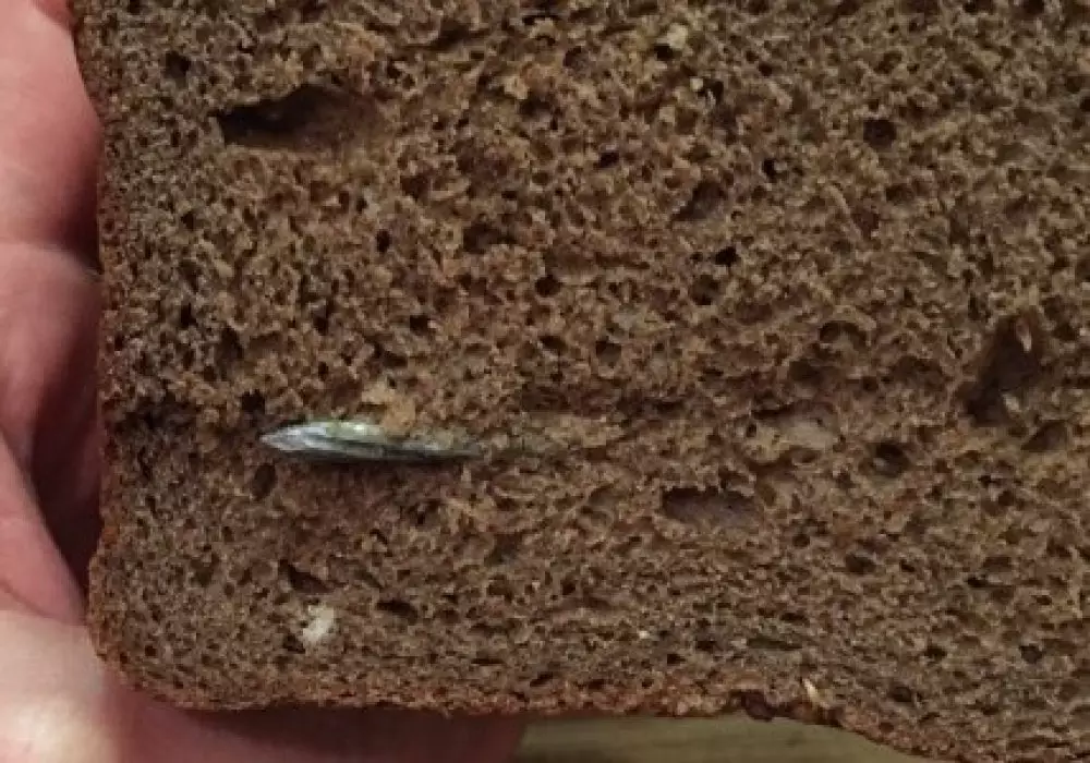 "Купили хлеб в магазине "Анвар". Когда дома накрывали на стол, в булке был обнаружен гвоздь. Обратились с чеком в магазин, отправили по указанному адресу предприятия. Прошу принять меры!" - написала Камила Гайнутдинова, приложив фото хлеба с гвоздем.