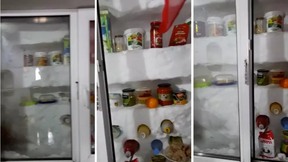 "Ассалаумағалейкүм, қазақ елі, холодильник - 2020! Биылғы бізге боранның берген пайдасы", - деп тұрғын "табиғи мұздатқышын" таныстырады. Осыдан кейін ол жоғарғы, ортаңғы және төменгі сөрелерді көрсетіп, қуыста ет барын да айтады. Оның айтуынша, мұндай құрылғы ток жемейді, нағыз үнем.
