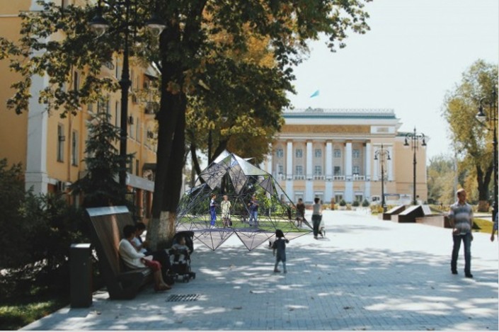 Автор отмечает, что горы - это словно некая граница, которая создает разрыв между людьми - между теми, кто живет в горных дворцах, и теми, кто живет в типовых городских застройках. Поэтому с помощью малой архитектурной формы ему захотелось спустить горы вниз, к жителям города. Зеркальные фрагменты будут отражать людей, деревья и небо вместе с традиционным смогом, собирая настоящий портрет Алматы.