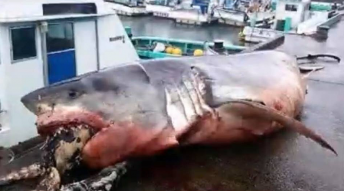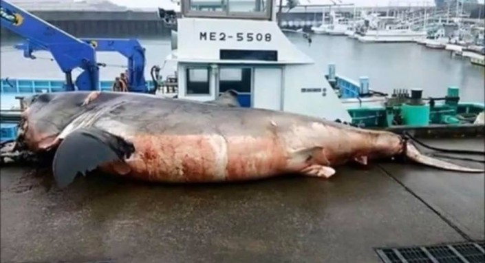 Японские рыбаки поймали гигантскую акулу, погибшую в схватке с черепахой