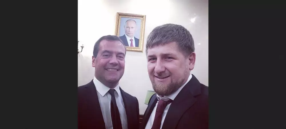 Премьер-министр России Дмитрий Медведев и глава Чечни Рамзан Кадыров сняли селфи на фоне портрета президента России Владимира Путина, передает корреспондент Tengrinews.kz.