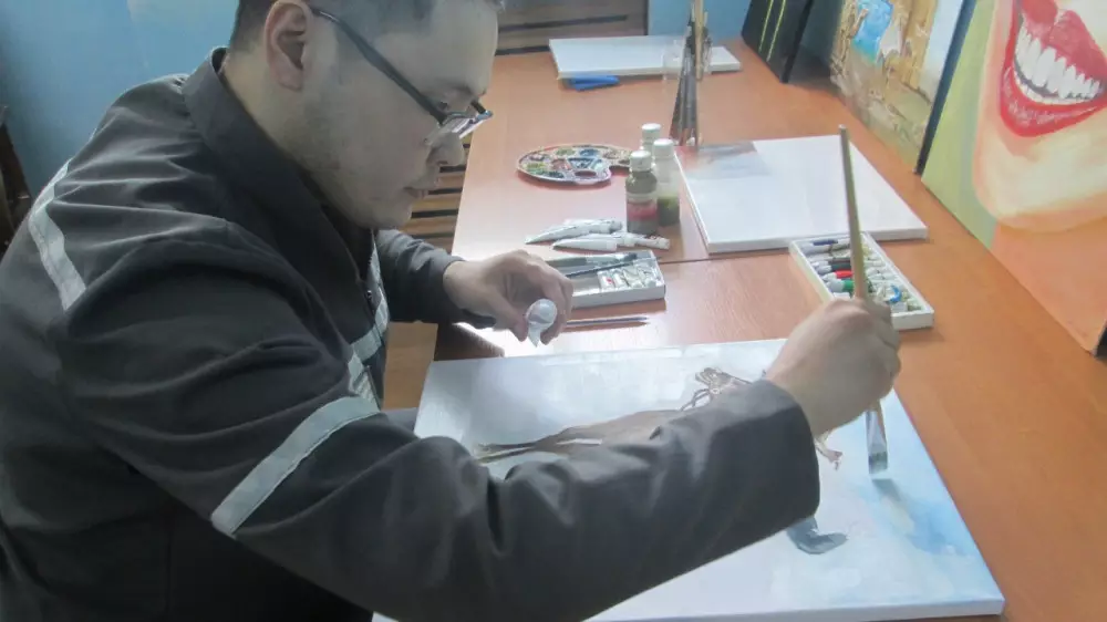 "Прибывая на краткосрочные свидания, отец осужденного приносит холсты и краски вместе с передачей. На данный момент осужденный уже погасил иск на сумму 500 тысяч тенге. Также он обучает и приобщает других осужденных к изобразительному искусству", - сообщил начальник учреждения АК-159/25, подполковник юстиции Улан Кусаинов.