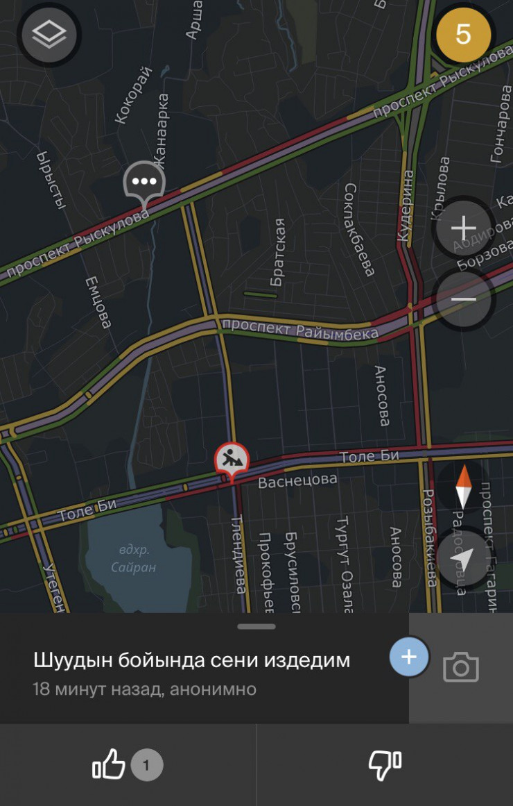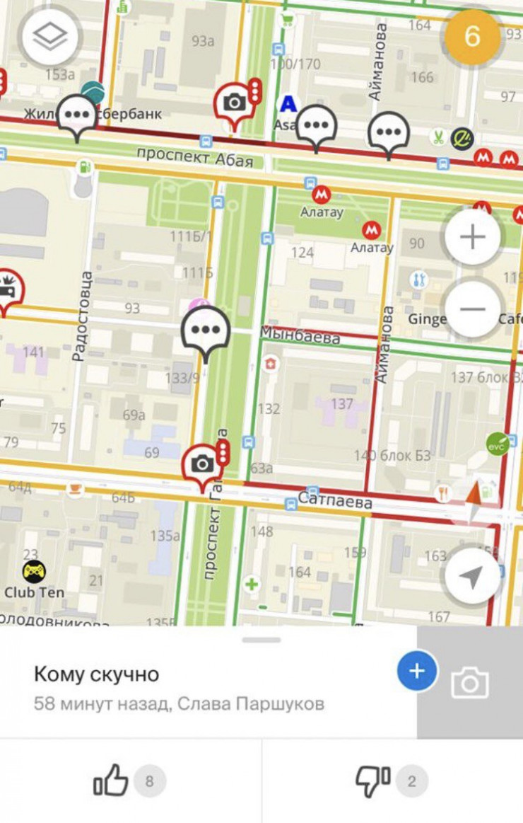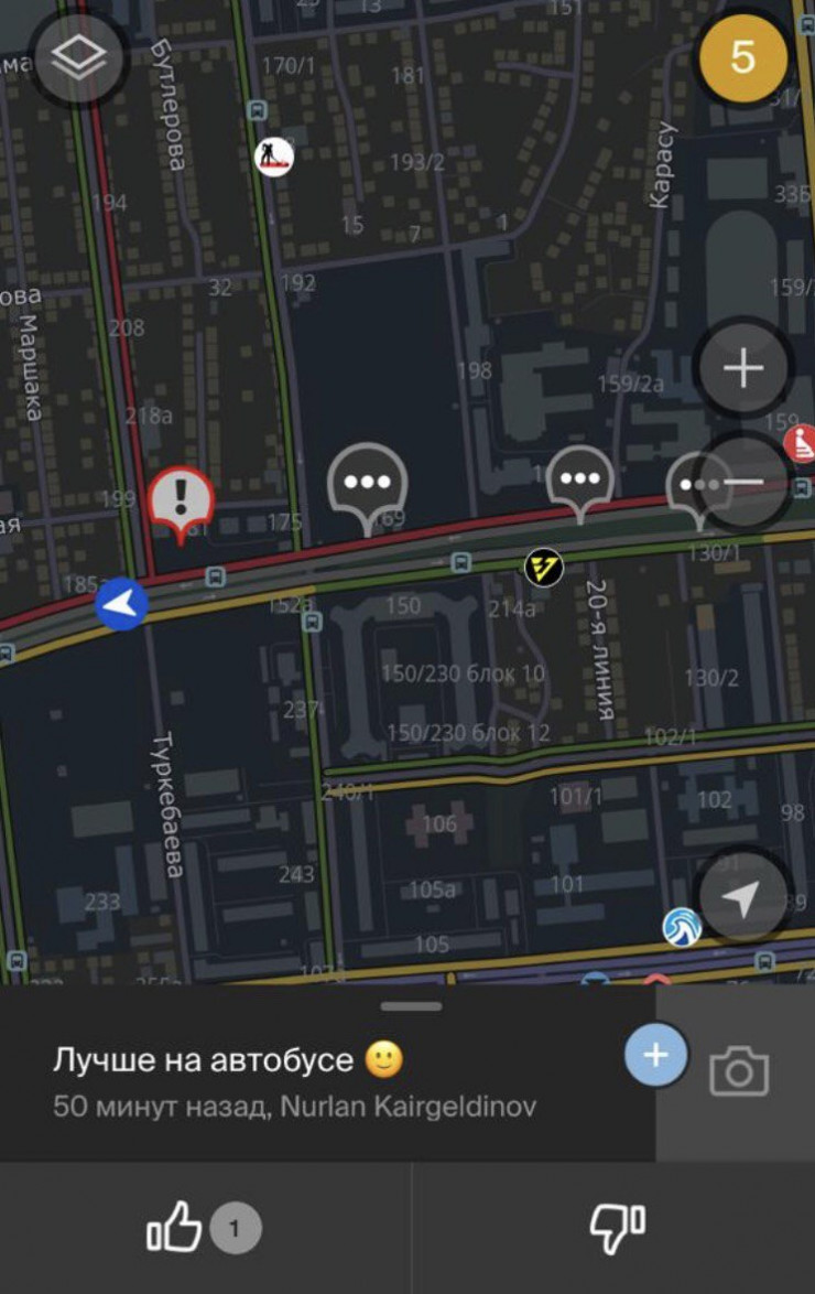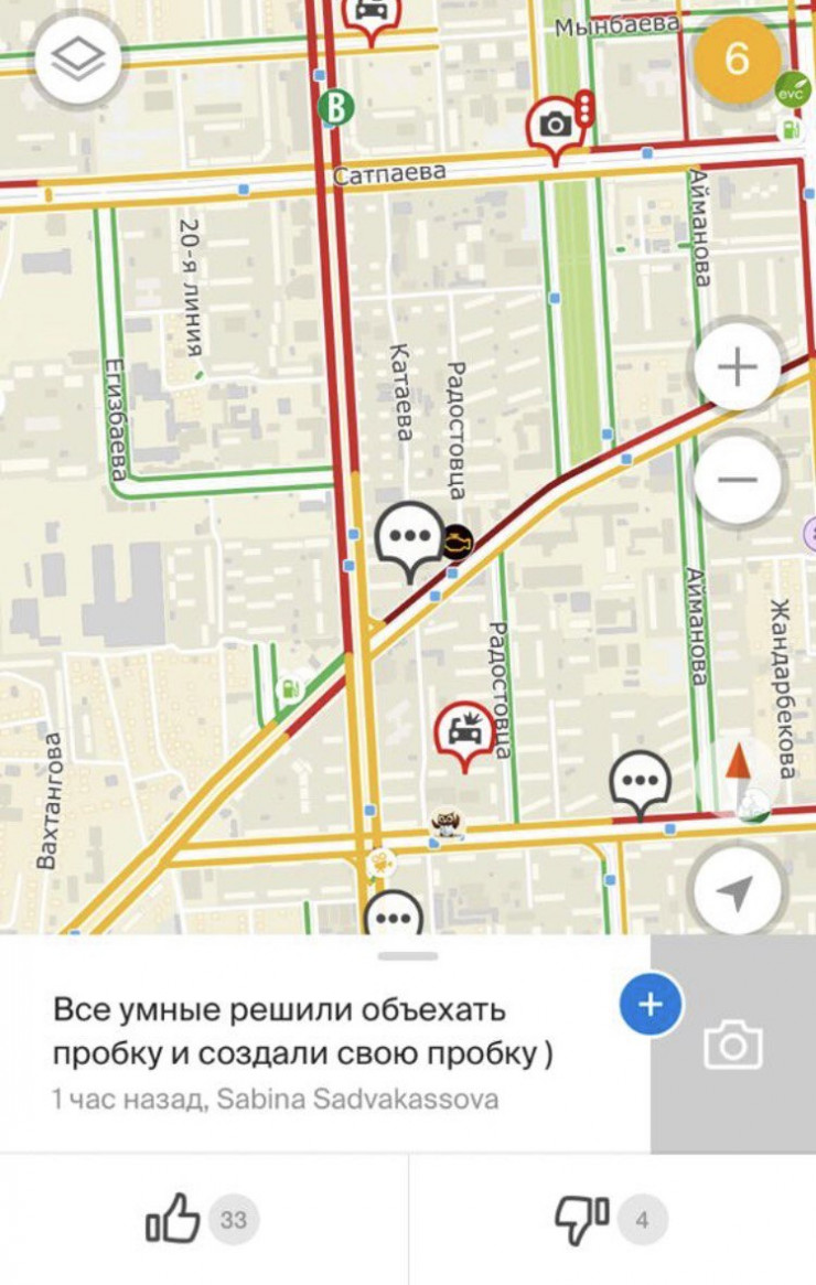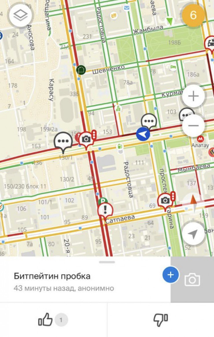 Таксист бұлай ағынан жарылған кезде бірнеше минут бойы қозғалыссыз тұрғанбыз. Амал жол, картадан кептелістерді көрсететін картаны ашып, қарап отырдым. Көшенің көбі қызыл түске боялған - кептеліс деген сөз.