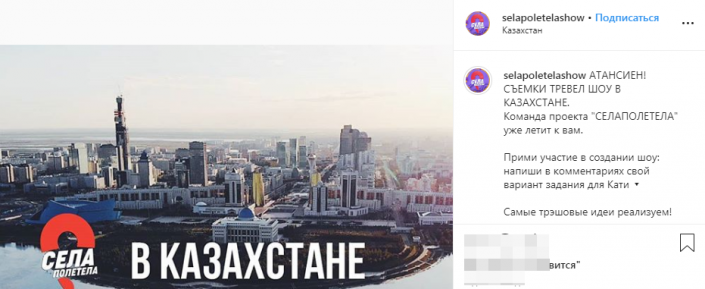 Команда белорусского трэвел-реалити-шоу "Селаполетела" предложила казахстанцам придумать задания для их ведущей Кати. Самые необычные из них коллектив трэвел-проекта обещает реализовать во время съемок в Казахстане.
