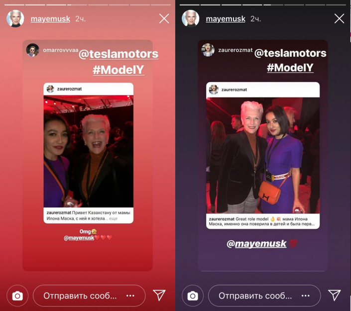 Также казахстанка опубликовала фотографию с матерью основателя Tesla Motors - Мэй Маск, которую женщина разместила в "историях" в Instagram.