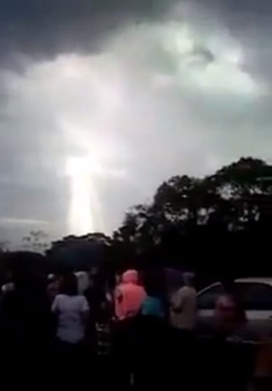Странное сочетание облаков и света образовало уходящую в небо светящуюся фигуру, напоминающую раскинутые в стороны руки человека. Очевидцы записали момент на видео и сделали несколько фото.