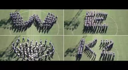На открытом стадионе в комбинезонах и кепи под микс современных танцевальных ритмов молодые парни и девушки то выстраиваются в стройные ряды, то "разбиваются" в буквы, ни на минуту не прекращая движений.