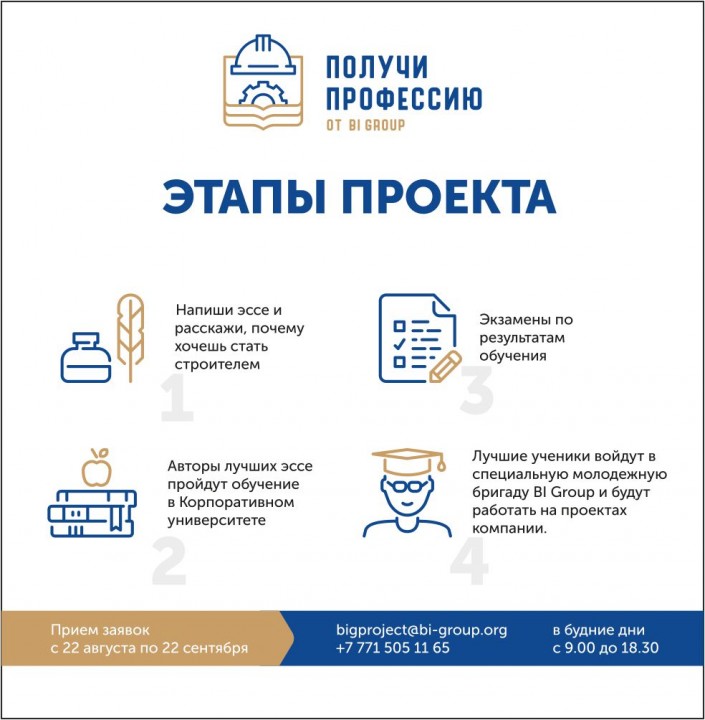 В проекте "Получи профессию с BI Group" могут принять участие граждане Казахстана в возрасте от 18 до 25 лет. Претенденты должны написать краткое эссе о себе (не более двух страниц формата А4), рассказав о том, почему они хотят получить строительную профессию. Единый адрес электронной почты для приема заявок: bigproject@bi-group.org. Также открыт телефонный номер горячей линии проекта: 8 771 505 11 65 (в будние дни с 9.00 до 18.30), по которому можно задать все интересующие вопросы и уточнить условия конкурса.
