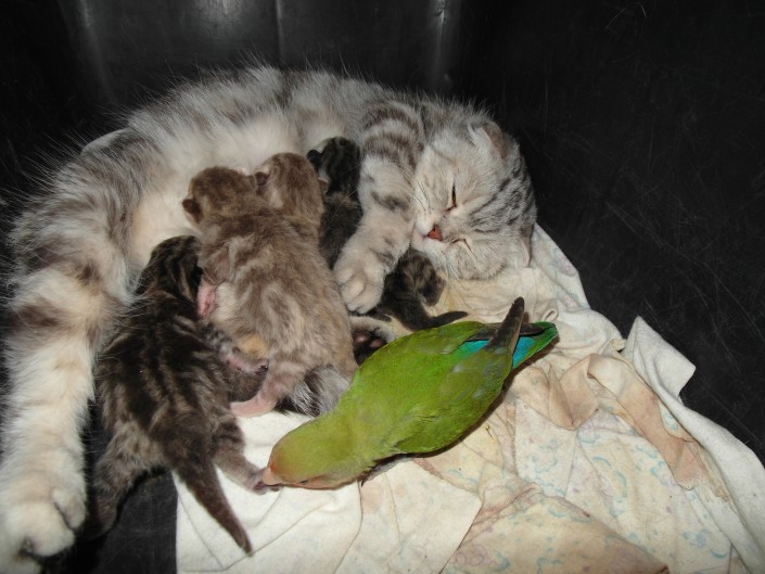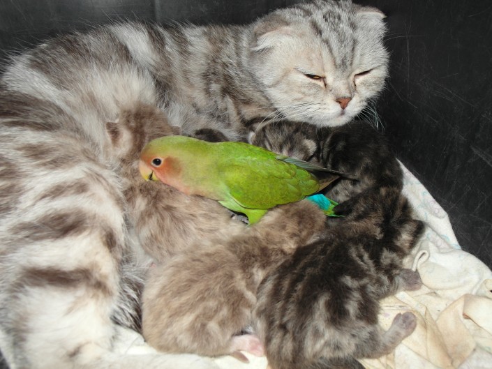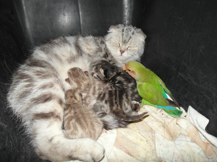 Виталий и Юлия Олесенко - ветеринары, поэтому дома у них живут самые разные животные. Одна из них - вислоухая шотландская кошка, которую ребята приютили, когда от нее отказалась хозяйка. Не так давно Маргарита произвела на свет пятерых котят, а незадолго до этого в квартире появился маленький попугай-неразлучник по кличке Кеша. Неожиданно для всех кошка и птица подружились. Да так, что теперь не только играют, но и спят вместе.