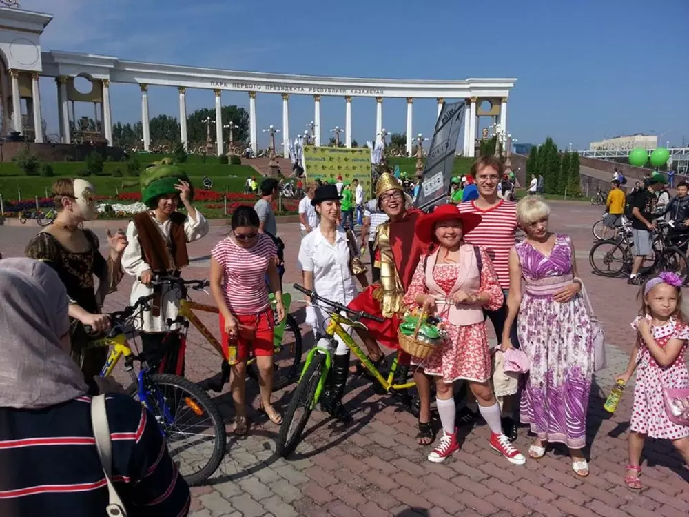 Алматинцы в казахских, римских и византийских костюмах проехали по улицам Алматы в честь дня спорта. Об этом корреспонденту Tengrinews.kz рассказал один из организаторов Александр Гегерис. Из 1,5 тысячи участников, 30 приехали в костюмах. Как отмечают организаторы, цель парада - развитие велосипедной культуры, здорового образа и туризма в Казахстане.