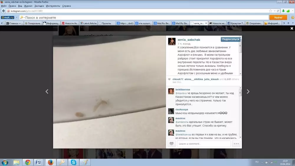 Российская телеведущая Ксения Собчак осталась недовольна самолетом авиакомпании "Эйр Астана", в котором прилетела в Казахстан 19 апреля, передает корреспондент Tengrinews.kz со ссылкой на страницу Ксении Собчак в Instagram.