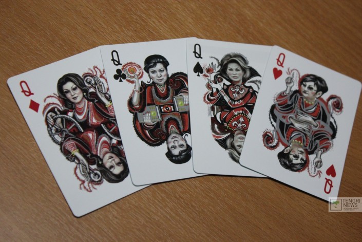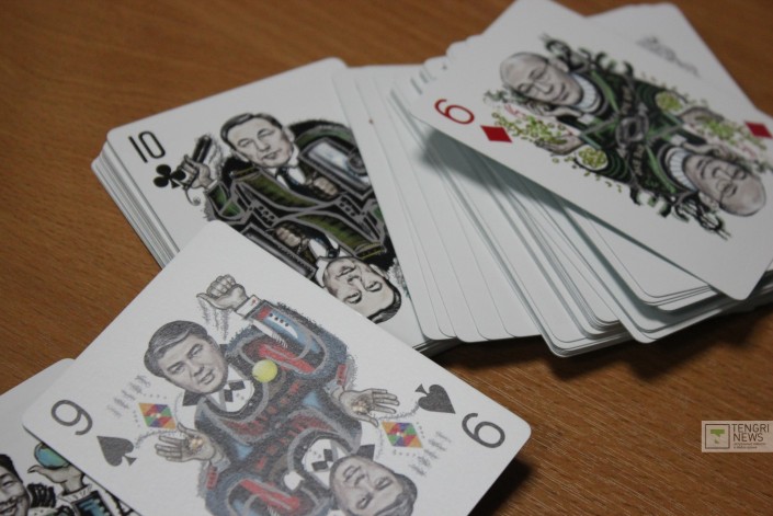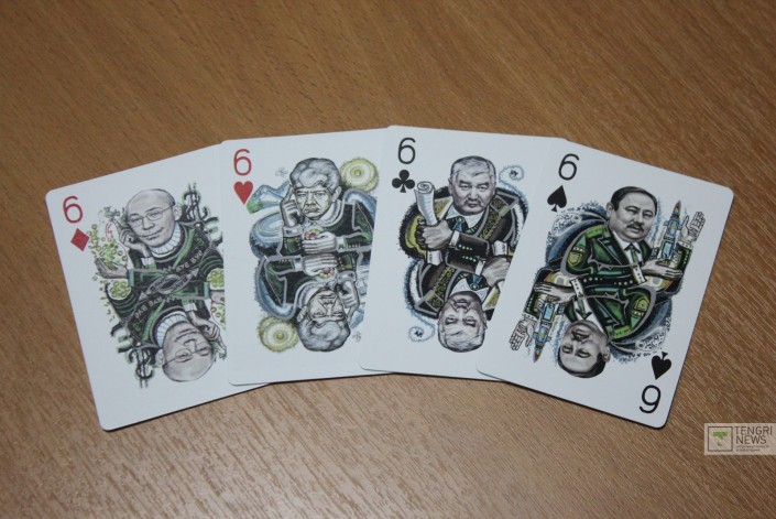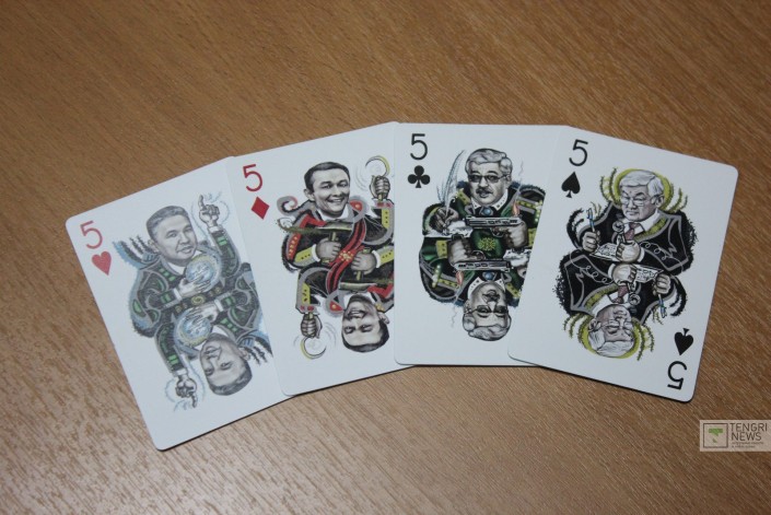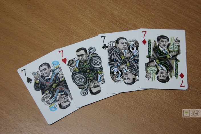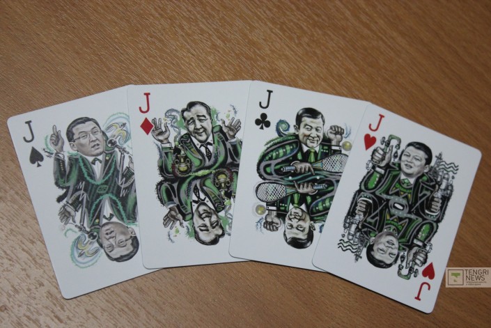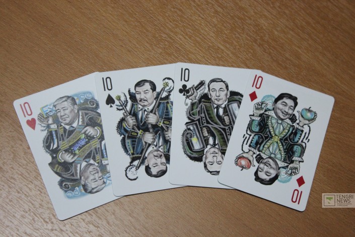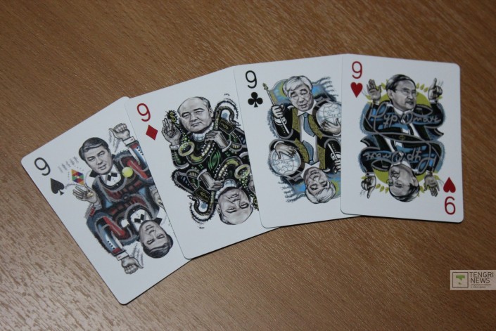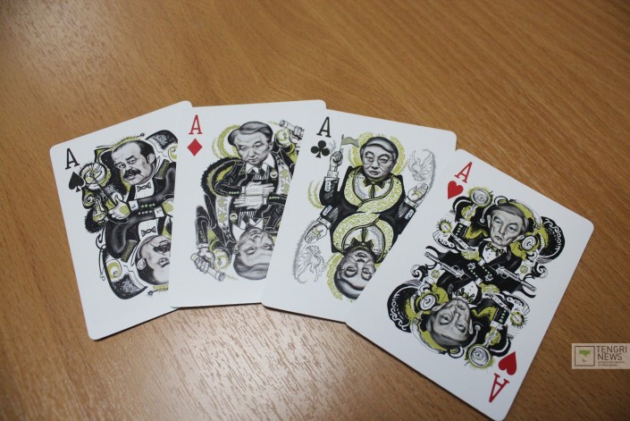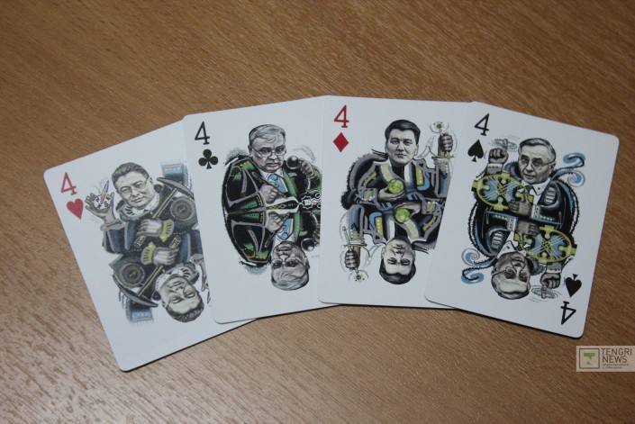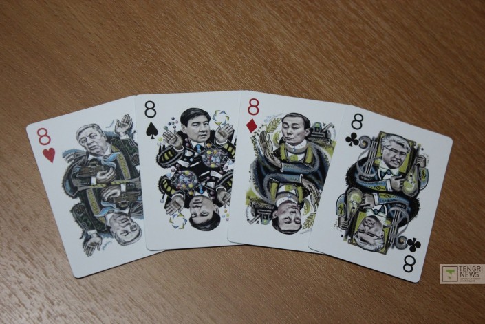 "Заметьте, какие цвета основных фигур: тузы - темные, как бы серые кардиналы. Короли - боевые - синие. Валеты - зеленые - добряки. И дамы - красные, в интригующем цвете", - комментирует Галым Байтук, отмечая, что в этот раз авторы поменяли дизайн шаржей. Кроме того, изображения на картах стали зеркальными.
