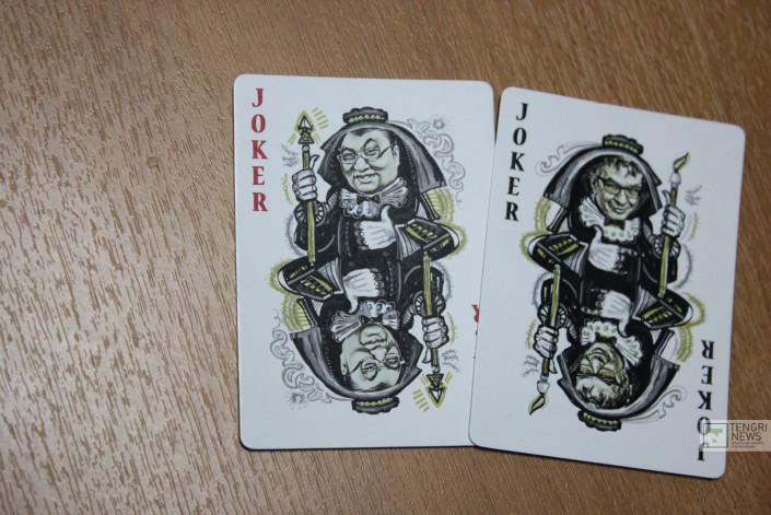 И впервые в политическую колоду включены два новых персонажа - Joker. На них изображены создатели колоды - Галым Байтук и художник Валерий Крестников, который исполнил дружеские шаржи.