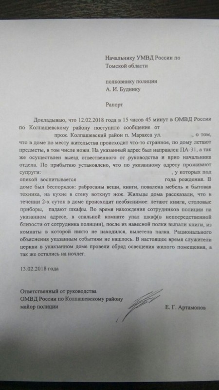 "В рапорте кратко и лаконично отражено все, что на самом деле происходило в этом доме. Нам вчера параллельно звонили и из полиции, и родители юноши, живущего в этом доме. Священнослужитель из Колпашевской епархии приезжал к этой семье, побеседовал с ребенком, с родителями, помолился. Он также был свидетелем всех тех вещей, которые описаны в рапорте. По приезде священника так называемый "полтергейст" немного утих, но потом эти явления продолжились вновь. Мы со своей стороны приняли решение курировать эту семью и приложить все усилия, чтобы такого в этом доме не было. Семье рекомендовали прийти в храм для беседы", - рассказал собеседник.