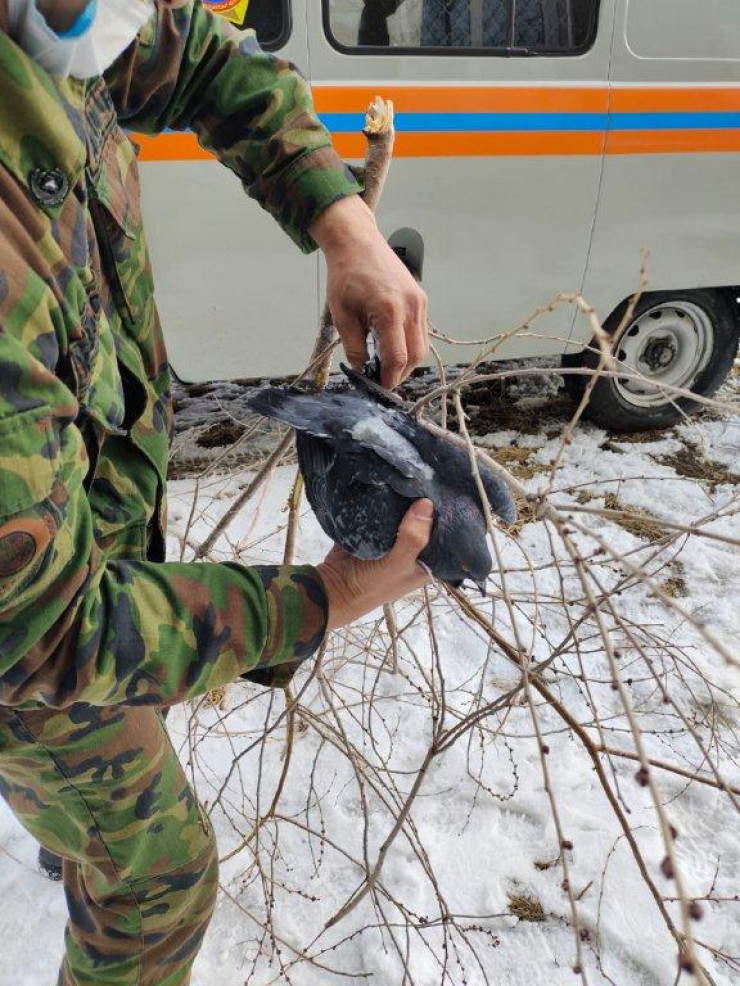Жители Усть-Каменогорске увидели запутавшегося в медицинской маске голубя на дереве. Он пытался спастись около суток. Голубь попал в ловушку. Прибывшим спасателям ДЧС ВКО оперативно удалось освободить птицу.
