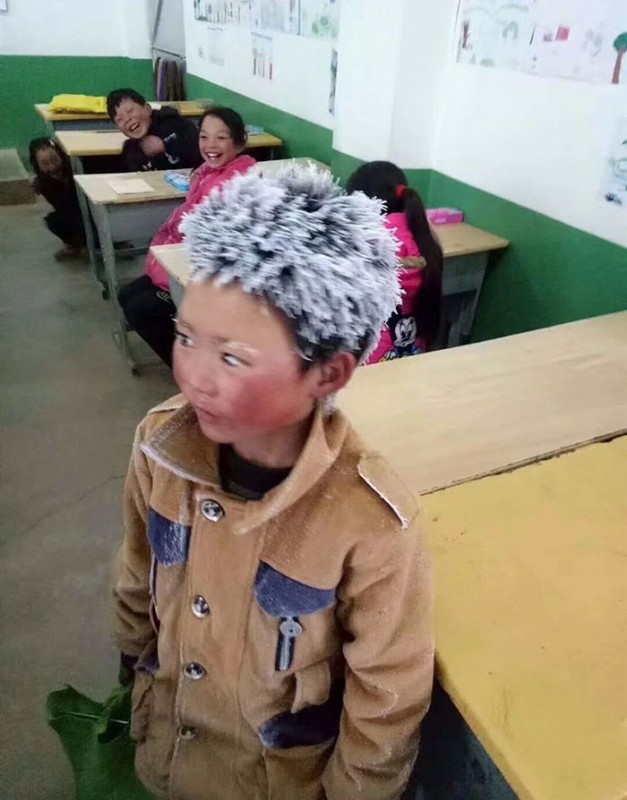 Восьмилетний мальчик из деревни Синьцзе стал знаменитым, когда его фотография попала в Интернет. Школьник прошагал по морозу в легкой одежде и без шапки. От такой прогулки брови и ресницы мальчика покрылись инеем, волосы буквально превратились в ледяные сосульки, а щеки горели огнем. Учитель сфотографировал отчаянного паренька и выложил снимок в соцсеть.