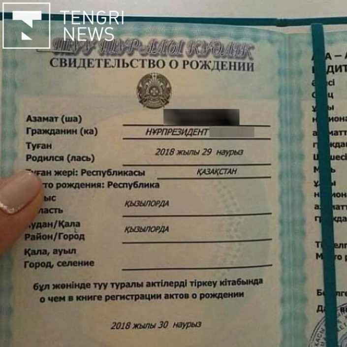"Да, действительно, есть ребенок с именем Нұрпрезидент. Ребенок второй в семье. Родители живут в Шиелийском районе Кызылординской области. Родители молодые, им по 26 лет", - сообщили корреспондентам Tengrinews.kz в отделе регистрации актов гражданского состояния Кызылорды.