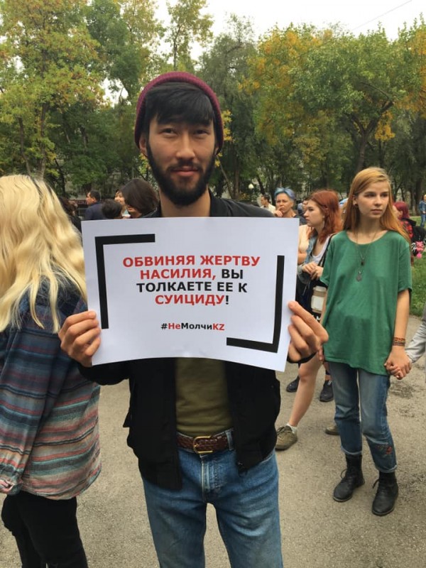 "Обвиняя жертву насилия, вы толкаете ее к суициду", - написано на плакате одного из участников.