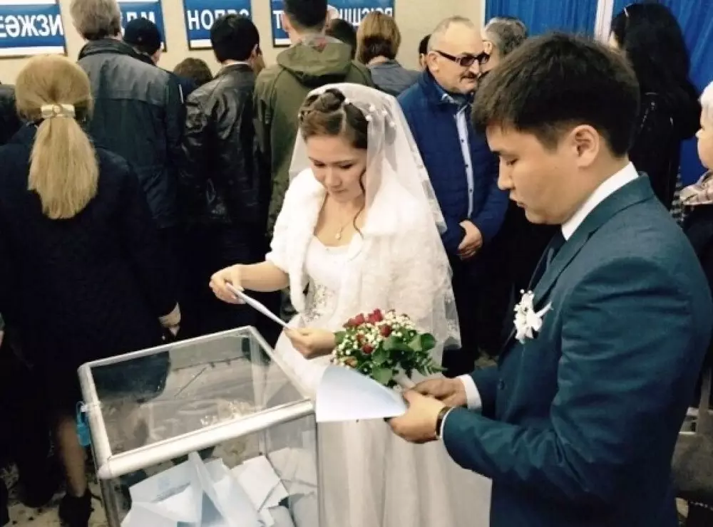 Молодожены проголосовали на избирательном участке в Астане, передает корреспондент Tengrinews.kz со ссылкой на пресс-службу столичного акима.