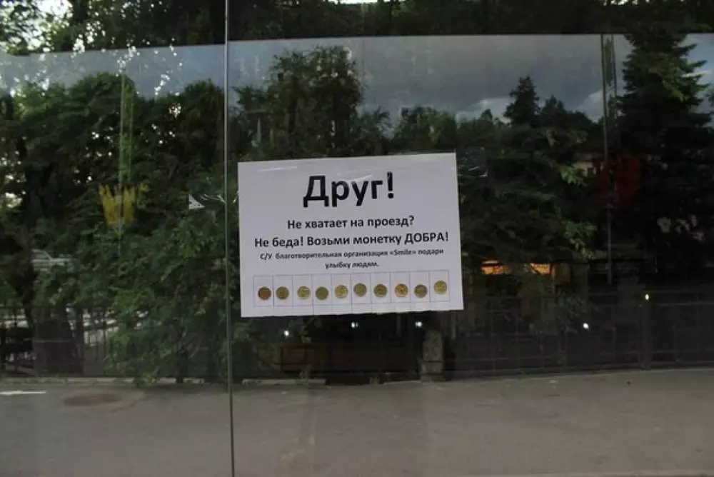 Необычные объявления гласят: "Друг, не хватает на проезд, не беда - возьми монетку добра!". Под надписью скотчем приклеены монеты номиналом в пять тенге. Любой желающий, у кого недостаточно мелочи для нужной суммы на проезд, может "оторвать" себе монетку. Акция особенно кстати, когда горожанам не хватает мелочи для оплаты через валидатор, ведь аппарат не принимает крупную валюту, а разменять деньги перед посадкой не всегда удается. Сейчас по городу на 45 остановочных комплексах размещены "монетки добра". Все они расположены по проспекту Абая.