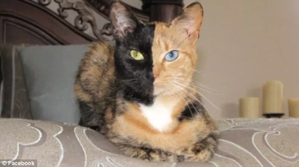 Кошка из США по имени Венера получила всемирную известность, благодаря своей необычной внешности. Ее морда как будто по линейке ровно разделена на две части. Шерсть на одной половинке - угольно-черного цвета, а на второй - рыжая. Кроме того, у кошки разные по цвету глаза - один голубой, другой - зеленый.