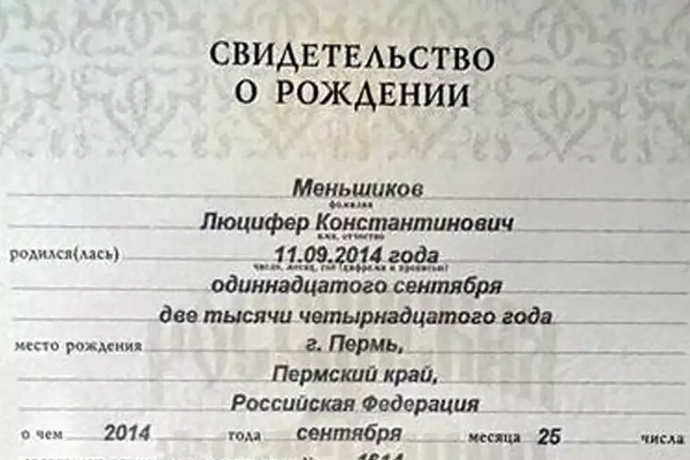 В Перми молодая супружеская пара назвала родившегося сына именем Люцифер. Свидетельство о рождении ребенка было выдано одним из городских ЗАГСов 25 сентября 2014 года, сообщает местное интернет-издание PRM.ru.