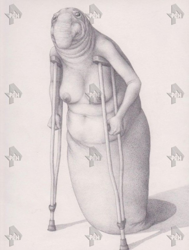 В эксклюзивном интервью РЕН ТВ художница рассказала, как и зачем создала Ждуна и показала первый эскиз мема. Оказалось, что Ждун изначально был женщиной. Кроме того, на эскизе присутствовали костыли.