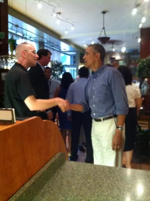 В закусочной Magnolia's Deli & Cafe в городе Рочестер на западе Нью-Йорка Обама заказал тост с сыром и томатный суп-пюре с гренками и кусочком огурца. Президент также угостил сотрудников своей службы безопасности. Общий счет на девять человек составил 89,84 доллара, плюс 20-процентные чаевые (16,64 доллара).