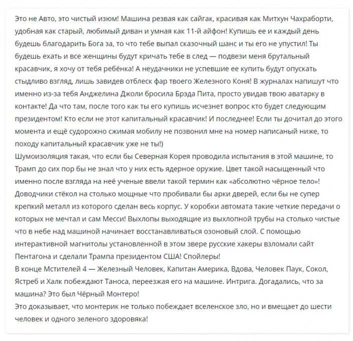 В интервью "Ладе" мужчина рассказал, как придумал текст: "Смотрел чужие объявления, пытался поставить себя на место покупателя, почему именно на мой товар он должен обратить внимание. Подумал и написал. Актуальная тема на сегодня - всем интересно, как победят Таноса (персонаж из фильма "Мстители" - прим.). Я тоже попробовал предугадать".