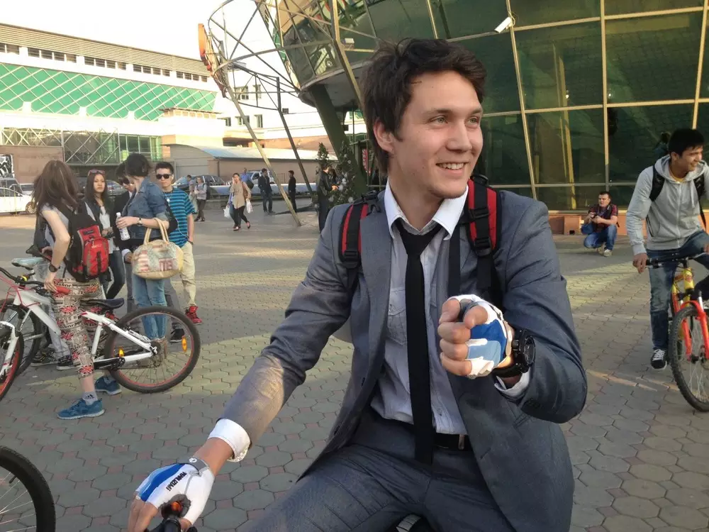 В Алматы прошел необычный флешмоб - десятки офисных работников сели на велосипеды в деловых костюмах и прокатились по центру города, об этом передает корреспондент Tengrinews.kz. Как рассказали организаторы, цель мероприятия - привлечь внимание водителей и общественности и рассказать им, что в Алматы тоже можно ездить на работу на двухколесном транспорте. "Это удобно, дешево и полезно", - говорят они. Известный журналист, музыкант Олег Белов (на снимке. - Прим. автора) также признался, что по возможности старается добираться до места работы на велосипеде. Правда, велодорожек в городе не так уж много. Флешмоберы придумали короткий маршрут - они стартовали с пересечения проспекта Абая и улицы Байтурсынова и доехали до улицы Достык. Главный идейный вдохновитель Дина Турганбаева решила собрать своих друзей через социальные сети. Она надеется, что после этой "тусовки" офисные работники всерьез задумаются о таком транспорте, а в городе машин станет меньше. Напомним, так называемое "открытие сезона" состоялось 14 апреля - сотни велолюбителей прокатились вместе с акимом Алматы Ахметжаном Есимовым, велогонщиком Александром Винокуровым по известному маршруту. Маршрут первого в этом сезоне велопробега проходил по проспекту аль-Фараби от улицы Таттимбета до парка Первого Президента, где по традиции всех участников ждали подарки и памятные призы, а также концертная программа.