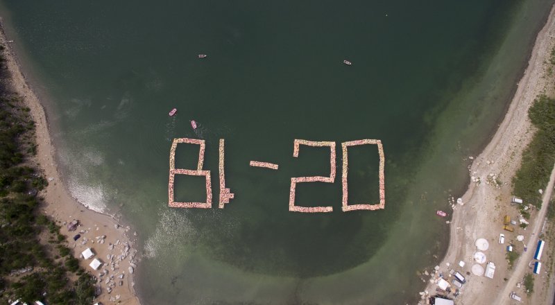 Праздник начался c поднятия флагов: Государственного - под гимн Казахстана и корпоративного - под гимн компании. После этого в приподнятом настроении сотрудники BI Group приступили к постройке с помощью плотов огромного логотипа "BI - 20" на поверхности озера Чебачье, в создании которого приняли участие около тысячи человек. И им это с успехом удалось под поддерживающие крики и овации оставшихся на берегу коллег. Огромное лого с высоты птичьего полета ярко красовалось на волнах Чебачьего и сегодня имеет все шансы попасть в Книгу рекордов Гиннесса как самое большое в мире.