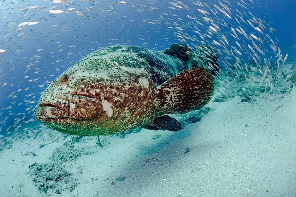Груперы (другое название - мероу) - рыбы из семейства каменных окуней. Это хищники, питаются мелкими акулами, рыбой, омарами, скатами, молодыми морскими черепахами. Груперы с силой засасывают добычу, благодаря строению верхней челюсти, которая может сильно выдвигаться вперед и принимать форму трубки при открывании рта.