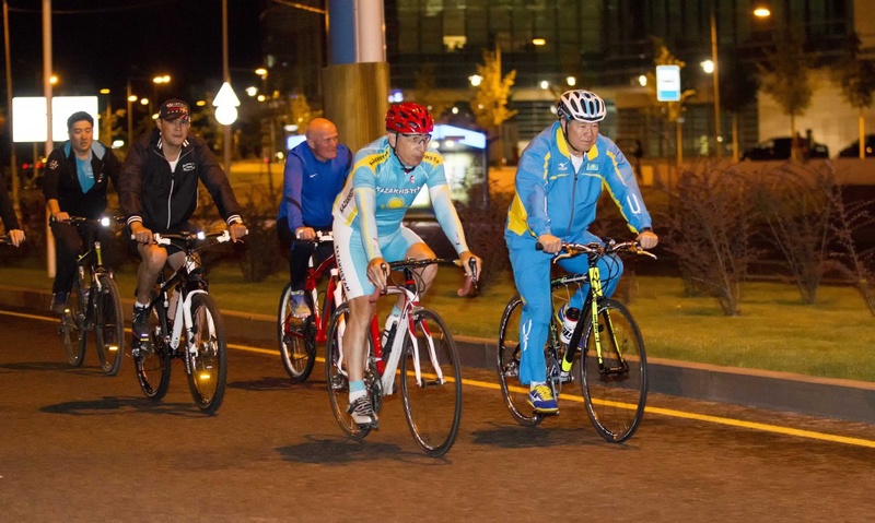 Первый ночной велопробег в Алматы собрал более 4 тысяч участников Первым стартовал и открыл ночной велопробег в Алматы аким города Ахметжан Есимов. Фото ©Фархат Сеитов