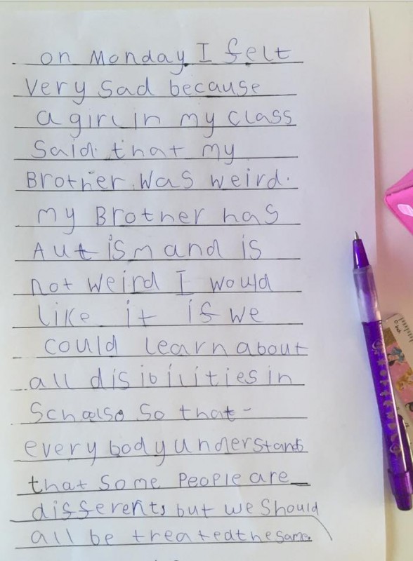 "В понедельник мне было очень грустно, потому что девочка из класса назвала моего брата "странным". Мой брат болен аутизмом, и он не странный. Я бы хотела, чтобы все в школах понимали, что люди разные, но ко всем нужно относиться одинаково", - написала Лекс в своем послании.