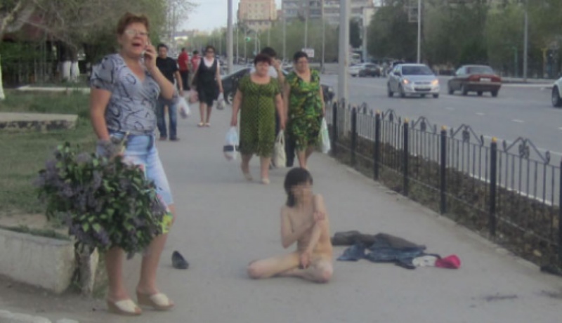 В Актобе по центру города бегала обнаженная девушка, пишет "Диапазон". Инцидент произошел 2 мая около 18.00. По словам корреспондента издания, ставшего очевидцем событий, в несколько метрах от остановки стояла молодая девушка, "в руке крутила сотовый телефон". Неожиданно она сняла футболку и джинсы и абсолютно голая легла на тротуар. Картина шокировала прохожих, возвращавшихся домой в час пик. Проходившая мимо женщина пристыдила девушку, та в ответ повалила ее на землю. Затем она выскочила на проезжую часть и стала бросаться под колеса машин. После вернулась и снова легла на тротуар. Корреспондент позвонил в службу скорой помощи, однако ему посоветовали самому вызвать психиатров и положили трубку. Мужчина позвонил еще раз и потребовал прислать бригаду медиков. Затем он позвонил в полицию, где его также пытались перенаправить к медикам, однако мужчина подчеркнул, что девушка кидается на прохожих и под машины. Полицейские пообещали прислать наряд. Обнаженная девушка тем временем забежала во двор жилого дома и села возле подъезда, шокировав сидевших на скамейке пожилых женщин и детей. Как оказалось, хулиганка живет в этом доме. Жильцы ее знают: "Она психически нездорова. Все время устраивает что-нибудь такое. Когда-то пыталась выброситься с балкона. Живет одна в квартире. Ей примерно 25 лет. Когда бывают обострения, ее увозят в психиатрическую клинику, но дня через три отпускают". Подъехавшие полицейские и медики посадили девушку в машину, несмотря на яростное сопротивление, и увезли.