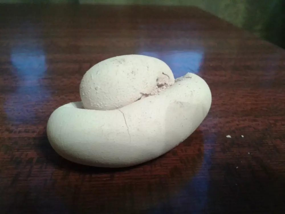 При этом содержимое яйца было, по его словам, совершенно обычным. Желток и белок Сологуб аккуратно из яйца удалил, а скорлупу причудливой формы оставил на память.